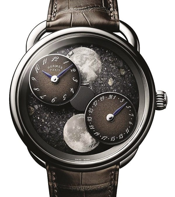 Серия Hermès Arceau L’Heure De La Lune, оснащенная мануфактурным калибром H1837 с модулем планетарной передачи о 117 деталях, в прошлом году пополнилась сразу несколькими вариациями на тему. Изюминка ее осталась прежней: конструкция механизма все так же позволяет следить за циклом сателлита Земли в Северном и Южном полушариях одновременно. Два подвижных циферблата (один – для часов и минут, второй – для стрелочного указателя даты), постепенно двигаясь, перекрывают часть верхней и нижней Луны, показывая ее текущую фазу. В число последних новинок вошла и модель с циферблатом, изготовленным из лунного метеорита, ограниченная тиражом в 36 индивидуально пронумерованных экземпляров.
