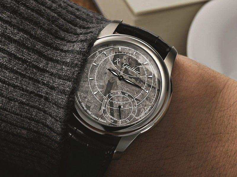 Независимый бренд Romain Gauthier, известный своими сложными моделями, в прошлом году анонсировал выход образцово костюмных часов, но оснащенных не самым традиционным циферблатом. У модели Prestige HMS Stainless Steel он изготовлен из обломка настоящего метеорита, который был обнаружен в кратере Хенбери, Австралия, еще в 1931 году. Что еще сразу бросается в глаза, так это отсутствие стандартной заводной головки, без которой 43-миллиметровый силуэт часов выглядит идеально круглым. Секрет прост: на самом деле та надежно спрятана с тыльной стороны и выдвигается лишь при необходимости. Собственный калибр 2206 HMS с ручным заводом, приводящий в движение смещенные от центра стрелки часов и минут, а также малую секунду у отметки «5», декорирован в соответствии с канонами высокого часового искусства.