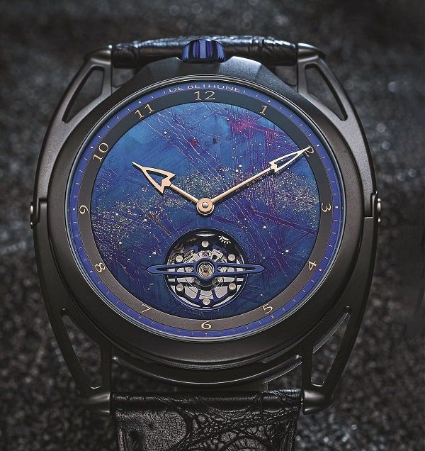 За многие века на спиле метеорита, на 90% состоящего из железа, а на 8,4% из никеля, сформировались так называемые видманштеттеновы линии. Это полосы, которые появляются в ходе кристаллизации металла в космическом холоде. Теперь увидеть этот уникальный узор можно на циферблате часов DB28XP Meteorite марки De Bethune. Также на нем, благодаря технике Microlight, появилось звездное небо. При этом мануфактура предоставляет будущему владельцу часов возможность самому определить, очертания какого созвездия увековечить. В 43 миллиметровом корпусе из матовой антрацитовой керамики бьется калибр DB2115v7, запатентованный титановый баланс которого открыт для обзора в окошке на «6 часах».
