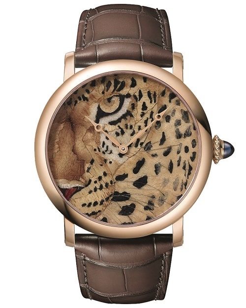 Многие годы в коллекциях дома Cartier «звучит» один и тот же рефрен: изображение пантеры. В 2019-м величественная хищница стала центральной темой лимитированного 30-ю экземплярами семейства Rotonde De Cartier Wood Marquetry, циферблаты которого были выложены в технике маркетри (мозаики). Анфас пантеры составлен из десятков тончайших кусочков дерева.