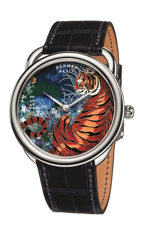 Французский дом Hermès в 2017-м украсил циферблаты нескольких тикающих pièce unique рисунками художницы Алисы Шерли. Тигр, сидящий в полоборота на циферблате уникальной 41-миллиметровой модели Arceau Tyger Tyger, выполнен в двух различных эмальерных техниках – расписной и перегородчатой.