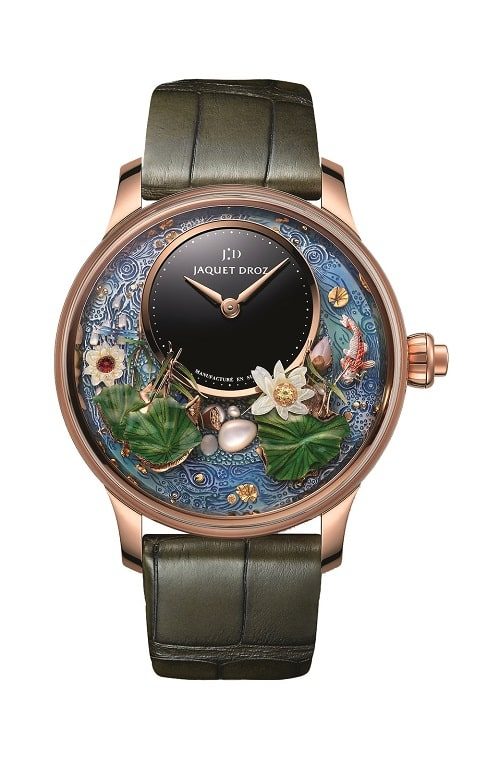 Искусный производитель автоматонов, марка Jaquet Droz в этом году превзошла саму себя, явив миру самый сложный из когда-либо созданных ею циферблатов. Он включает в себя сразу три анимированных элемента и демонстрирует все традиционные ремесленные техники отделки. Периферийный диск-пруд вращается, объемный миниатюрный карп бьет хвостом, а драгоценная сердцевина лотоса меняет установленные в середине драгоценные камни.