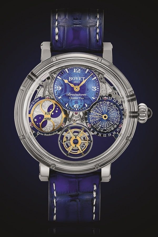 В ряды выдающихся скелетонов совсем недавно влились и 60 сверхсложных Bovet Recital 26 Brainstorm Chapter Two – все в том же каноническом многокомпонентном сапфировом корпусе, наклонном и сужающемся книзу. Такая архитектура позволяет во всех деталях рассмотреть калибр 17DM06-DT с ручным заводом, помимо двух сферических индикаторов (второй часовой пояс и фазы Луны) располагающим «парящим» турбийоном с секундной стрелкой на каретке. Часы и минуты отображаются на отдельном децентрализованном субдиске из прозрачного голубого кварца.