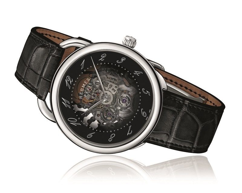 Дом Hermes в 2020-м переосмыслил классические «костюмники», добавив в актуальный брендбук еще одну скелетонизированную версию элегантных Arceau, – но уже в стальном корпусе с диаметром, равным не 41, а 40 мм. Со стороны циферблата благодаря дымчато-серому сапфировому стеклу прекрасно просматривается персонализированный силами компании калибр Sellita SW 300, не только избавленный от излишков металла, но и отделанный «жемчужным зернением».