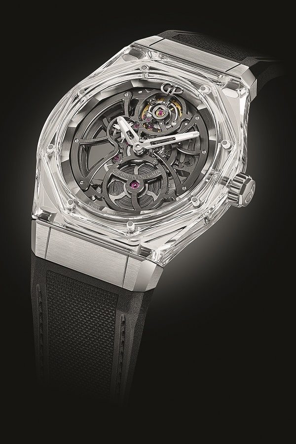 Сапфировый корпус – удовольствие во всех смыслах дорогое. Впрочем, несмотря на трудоемкость обработки кристаллов, прозрачные «латы» который год не выходят из моды. В 2020-м в сапфир и титан «облачился» еще один новичок: 44-миллиметровый двустрелочник Girard Perregaux Laureato Absolute Light. Платина модели впервые представлена в виде восьмиугольника, соединенного винтами с безелем по углам. Удачное сочетание фактур подчеркивает лаконичный шарм скелетонизированного мануфактурного калибра GP01800. С оборотной стороны отлично просматривается резной ротор из белого золота. Черное кольцо с NAC-покрытием разделено на 12 изогнутых сегментов между отполированными до зеркального блеска треугольниками, играющими роль стилизованных часовых меток.