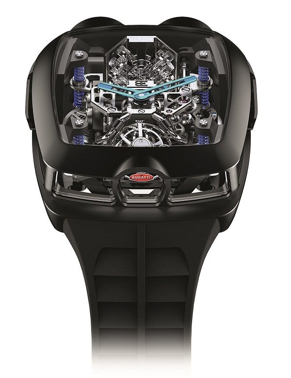 Еще один «автомобильный» релиз появился на свет благодаря тому, что марка Jacob & Co. ударила по рукам с компанией Bugatti. Итог совместного сотрудничества, калибр JCAM37, не затмит никакой циферблат, – ведь он выглядит точь-в-точь как двигатель одноименного гиперкара (только в миниатюре). И внешне имитирует «исходник» вплоть до 16 сапфировых цилиндров, которые после нажатия на специально отведенный «пушер» начинают двигаться вверх и вниз ровно так же, как реальные прототипы. «Парящий» турбийон с наклоненной под углом в 30° кареткой прилагается.