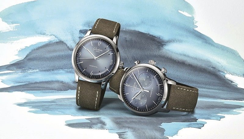 Новые версии Sixties Annual Collection авторства немецкой мануфактуры Glashütte Original в этом году обрели градиентные нежно-голубые циферблаты, сатинированные узором «солнечные лучи». Для этого латунные циферблатные диски после придачи им куполообразной формы обработали гальваническим никелевым покрытием, по краям которого распылили темно-синий лак. Центральная часть детали была покрыта лаком расцветки glacier blue («ледниковый синий»).