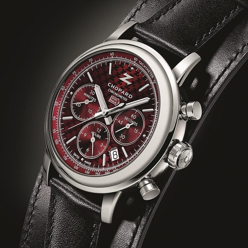 Еще одна премьера схожей тематики пополнила к нынешнему году знаковую коллекцию мануфактуры Chopard – Mille Miglia. Она стала больше на 100 хронографов, выпущенных в честь столетия дизайн-бюро Zagato (обслуживающего crème de la crème мирового автопрома). Так что лакированный циферблат цвета бургундского украшает символичный принт в виде буквы Z.