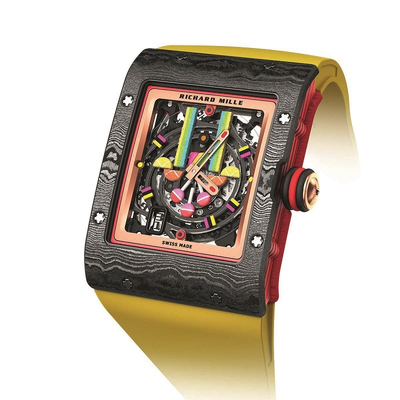 Нишевая люксовая марка Richard Mille в прошлом году выпустила яркую коллекцию под говорящим названием Bonbon (то есть конфетки). Отсюда и смешение самых насыщенных цветов, и соответствующий духу декор. Броский внешний вид модели RM 16-01 складывается из корпуса, комбинированного из TPT-кварца и TPT-карбона и скелетонизированного циферблата, на котором закреплены миниатюрные разноцветные леденцы.