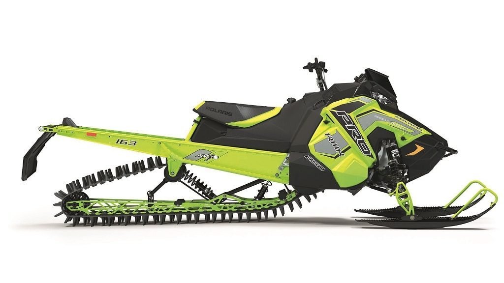Polaris 850 Pro-RMK 163 – это выдающийся горный снегоход, который отличают мощный силовой агрегат, равно как и легкость и прочность конструкции. Пожалуй, главный козырь модели 2019 года – новый двигатель Patriot 850, обеспечивающий в сочетании с вариатором Team серии P-85 быстрый разгон. Благодаря широкому использованию в конструкции углеродного волокна, а также за счет уменьшенных неподрессоренных масс американец стал буквально легче на подъем. Новая короткая и легкая гусеница Series 7.0 спроектирована с прицелом на езду по экстремально глубокому снегу. Новая передняя подвеска Pro-RMK React позволяет регулировать расстояние между лыжами (от 914 мм до 965 мм), обеспечивая легкое и уверенное управление. Имеется также и стабилизатор поперечной устойчивости, способствующий более уверенному прохождению виражей. Доработана задняя подвеска с облегченными компонентами, внедрена новая конструкция накладок на лыжи Hyfax. Немаловажно, что регулируемая носовая часть американского снегохода оснащена коваными рычагами и поворотными цапфами, так что теперь значительно легче направлять такие «сани» вверх по склону холма.