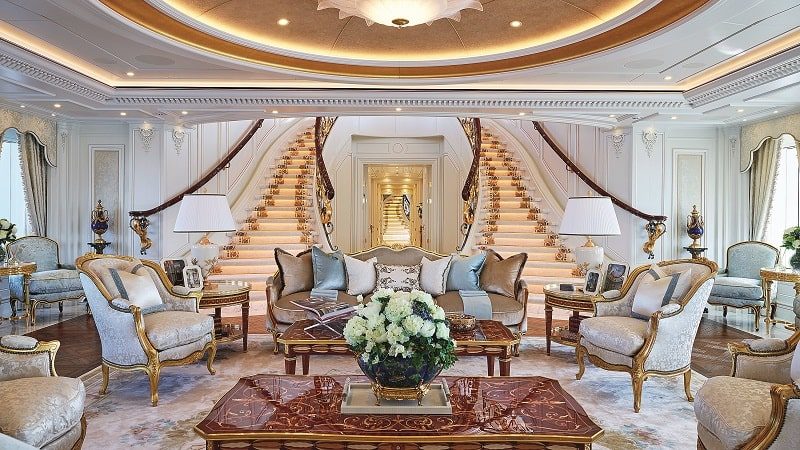 На борту TIS, которая со своей длиной 111,5 м занимает 33-e место в сотне крупнейших яхт мира, слова «дворец на воде» не воспринимаются как фигура речи. Это действительно дворец, в буквальном смысле – в архитектуре, отделке и меблировке отсылки к Версалю, Эрмитажу и легендарным гранд-отелям Европы налицо.