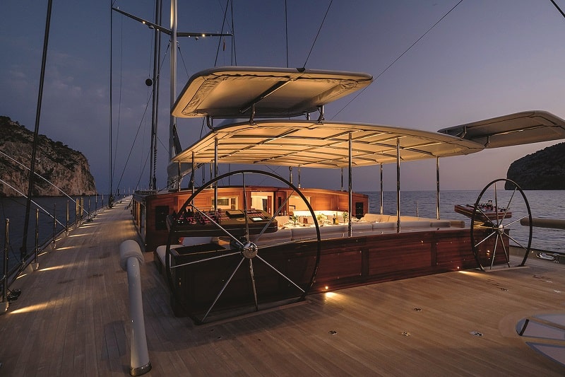 Марк Уайтли из студии Mark Whiteley Design оформил его во вкусе американской Новой Англии: нижняя часть стен обита красным деревом, верхняя выкрашена в белый, текстиль холщовый, латунные ручки надраены – все очень добротно, уютно, консервативно. Впрочем, в нарочито «старомодную» стилистику дизайнер сумел привнести нотки самых свежих трендов. Например, световой люк в палубе выполнен в виде лепестков цветка вокруг бизань-мачты и очень украшает хозяйскую каюту. А традиционную тиковую палубу тонировали светло-серым, в контраст к иссиня-черным бортам яхты, которые блестят, как крышка рояля.
