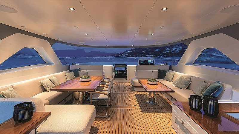 Открытый проход по палубе, ведущий от кормового кокпита к носу, оставлен только с правого борта, а полностью закрытый левый борт «съел» этот проход в пользу салона, получившего дополнительные 10 кв. м площади, что для судна длиной всего 31,1 м существенно. Внешне разница замаскирована темным остеклением, так что элегантный экстерьер ничуть не пострадал. Откидывающийся над водой балкон, зоны отдыха al fresco, оборудованные на носу, на флайбридже и в кокпите, а также стационарная купальная платформа, где можно поставить пару шезлонгов, тоже дают ощущение гораздо большего пространства, чем есть на самом деле. Как и минималистичный интерьер, где стекло, зеркала и различные текстуры поддерживают виртуозную игру с объемами.