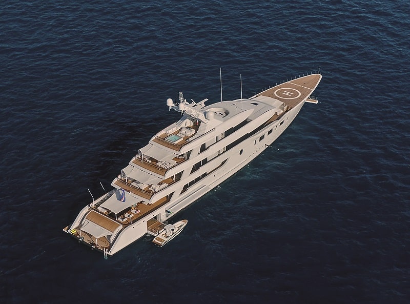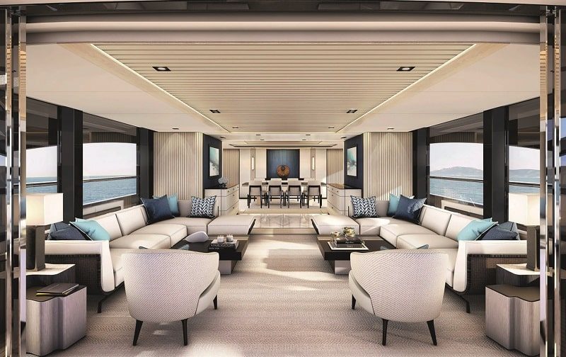 Интерьер – плод совместных усилий дизайн-подразделения верфи и бюро Salvagni Architetti, а из предложенных вариантов отделки заказчик выбрал версию студии Visionnaire в платиновых тонах. Два двигателя MAN V12-1400 разгоняют 499-тонное судно до 15 узлов, с комфортной круизной скоростью 12 узлов дальность хода составит 4500 морских миль.