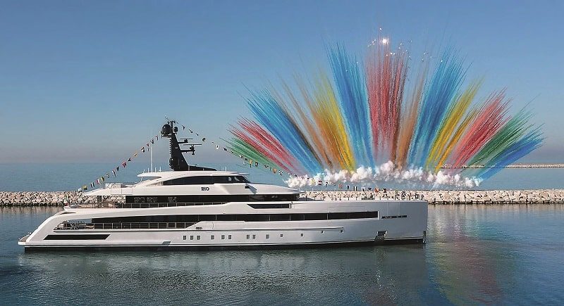 Новинка концерна Ferretti Group, куда входит верфь CRN, – моторная яхта Rio, торжественная церемония ее спуска состоялась в городе Анкона (Италия) в январе 2022 года. Проект с заводским номером C138 реализован по принципу full custom. Четырехпалубное судно длиной 62 м и шириной 11,2 м построено из стали, надстройка алюминиевая. Спортивный внешний вид Rio – вертикальный нос и сплошное остекление нынче самый острый тренд! – заслуга нидерландской студии Omega Architects, возглавляемой всемирно известным яхтенным дизайнером Франком Лаупманом. За внутреннюю планировку и оформление отвечало бюро Pulina Exclusive Interiors из Пизы. Проектировщики постарались сделать обитаемые пространства для 12 гостей как можно более функциональными, не забывая о приватности: к хозяйским апартаментам прилегает собственная палуба, между этажами курсирует лифт, на нижней палубе оборудован оздоровительный центр с массажным кабинетом, хаммамом, душем с хромотерапией, фитнес-залом и прямым выходом к пляжному клубу на корме. Учли разработчики и «зеленую» повестку: яхта оснащена системой тригенерации (генерирование одновременно нескольких видов энергии, включая электричество, тепло и холод), а также солнечными батареями, использование которых поможет сократить потребление электроэнергии на 79%.