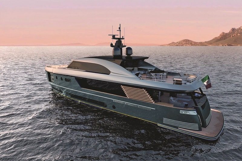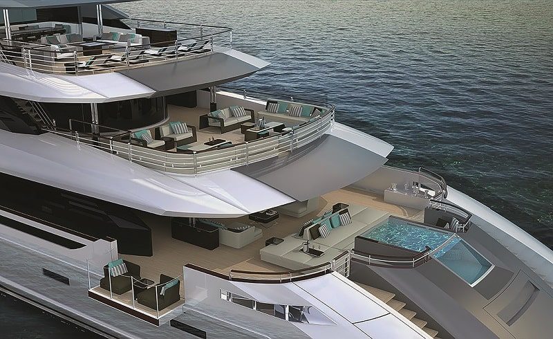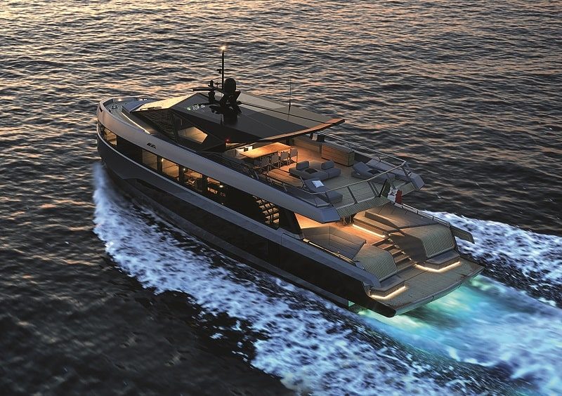Над ее созданием работали настоящие светила индустрии: концепция и внешний брутальный дизайн – от Кена Фрайфоха, инженерную разработку экономичного корпуса из карбона и стеклопластика выполнили специалисты компаний Alberto Mancini Yacht Design и PierLuigi Ausonio Naval Architecture, интерьер оформила студия De Cotiis Architects.