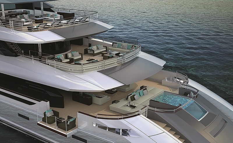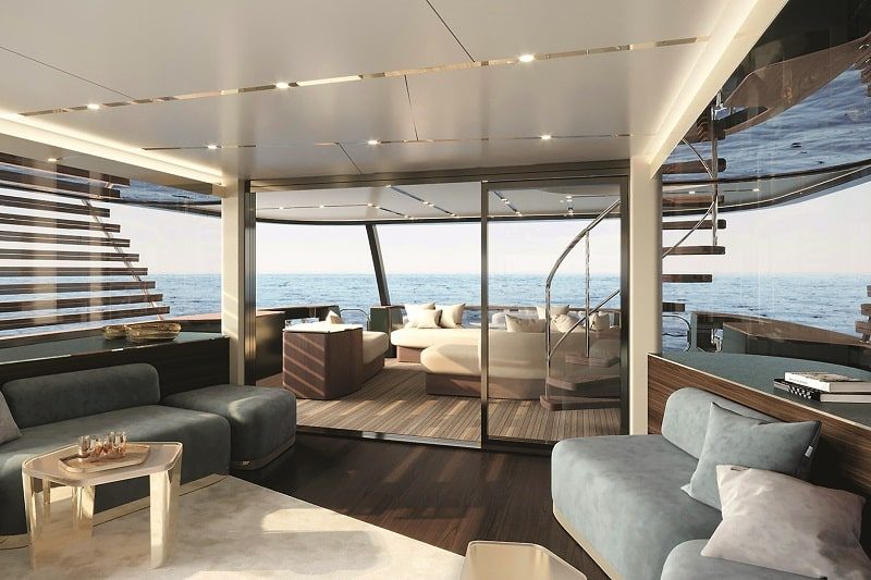 Благодаря форме корпуса увеличились также полезные объемы – на борту 200 кв. м внутреннего жилого пространства. Рулевая рубка, салон и мастер-каюта на носу фактически окружены стеклом, да и три гостевых сьюта на нижней палубе имеют беспрецедентную площадь остекления. Откидные борта на корме расширяют территорию пляжного клуба, открывая доступ к морю с трех сторон. Интерьер от A. Vallicelli & C Studio дополнен изящными аксессуарами Hermès.