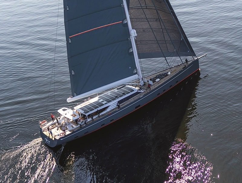 Размерения судна – длина 44,6 м (по ватерлинии 41,8 м), ширина 9,45 м – позволили разместить на борту не только четыре комфортабельных гостевых сьюта и каюты экипажа, но и достаточно технических помещений для припасов, обеспечивая завидную автономность. С той же целью в крышу надстройки интегрировано 60 кв. м солнечных панелей. Благодаря подъемному килю осадка меняется с 5,9 до 3,4 м, что дает возможность заходить даже в мелкие лагуны – и все эти новые акватории можно будет исследовать с помощью пары экологически чистых тендеров с электромоторами.