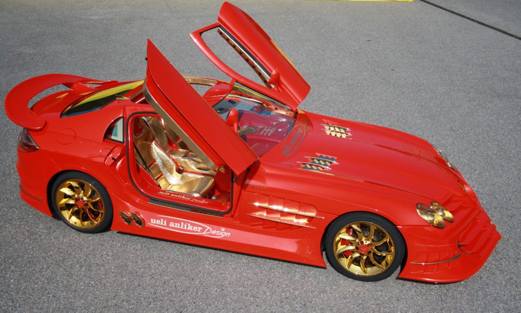 Усилиями швейцарского ателье Ueli Anliker Design серийный Mercedes-Benz McLaren SLR превратился в настоящую сокровищницу и вошел в список «Самые дорогие автомобили арабских шейхов». На отделку ушло 14 кг золота и сотни рубинов. По желанию заказчика, золото 999 пробы использовалось, где можно, и где, казалось бы, нельзя – в отражателях фар, на рулевом колесе, панели приборов и даже в патрубках выхлопной системы. Та же история с рубинами. Ими украшены не только кнопки и тумблеры, но даже болты, заклепки и гайки. Под стать богатому одеянию исполинский мотор 999-сильный V8, ускоряющий «золотоносца» до 100 км/ч за 3 с, невзирая на драгоценный балласт.