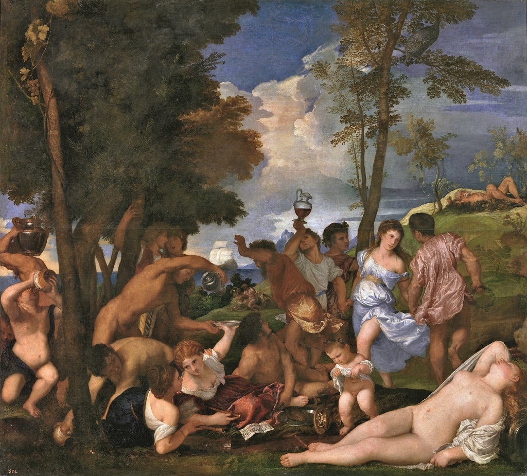 Когда Средневековье окончилось, настало время вспомнить об островах в том же ракурсе, в каком думали о них древние греки. Возьмем Андрос – он тоже в Эгейском море, не так уж далеко от Патмоса. Но населяли его, судя по картинам, люди совсем другого образа жизни! Великий Тициан написал это полотно для личных покоев феррарского герцога, так что можно было не стесняться наготы. На картине изображен праздник, устроенный в честь бога Вакха. Этот покровитель виноделия и винопития с минуты на минуту прибудет на остров вместе со своей невестой Ариадной – паруса корабля можно разглядеть вблизи берегов. Поразительно, что это не просто личная вариация Тициана античной темы, каких много бывало в эпоху Ренессанса. Все гораздо серьезнее: Тициан взял книгу древнегреческого писателя Филострата Афинского «Картины», где описывалось 65 работ античных художников. Открыл 25-ю главу и попытался по словесному описанию воспроизвести изображение. Небывалый пример виртуальной живописи.