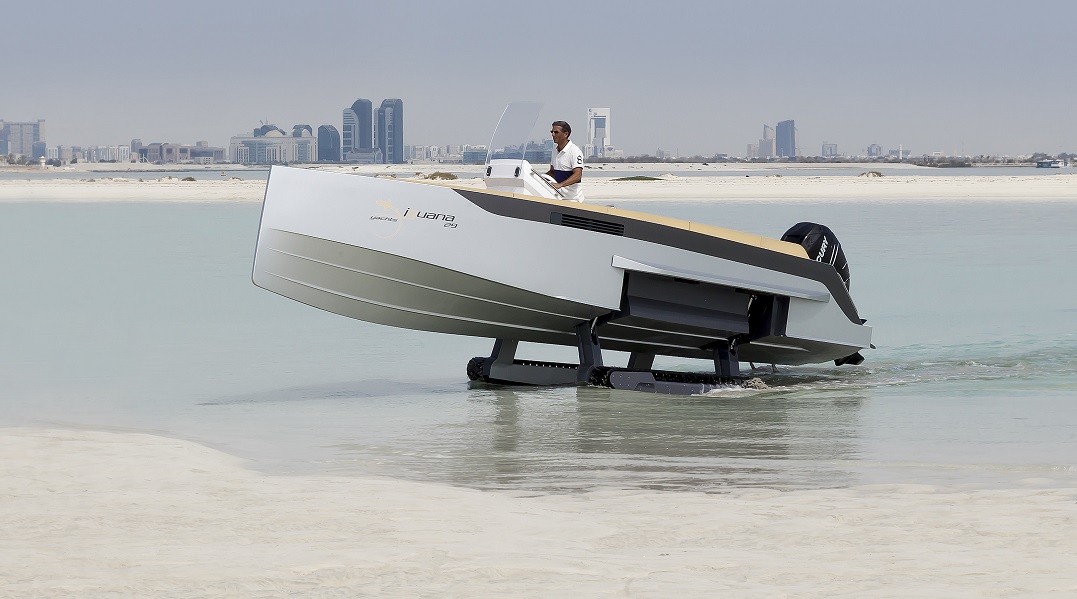 На воде тендер-амфибия от французской компании Iguana Yachts выглядит как обычный катер, но при подходе к берегу из бортов выдвигаются гусеницы – переход из одного состояния в другое происходит всего за 15 секунд – и далее можно преодолевать береговую линию, самостоятельно добираясь, к примеру, до стоянки с трейлером. 29-футовые вездеходы предлагаются уже в трёх вариантах комплектации: Classic, Adventure, и самая свежая новинка 2015 года – Exclusive. Катер, оснащённый подвесными моторами мощностью 300 л.с., на воде развивает скорость 40 узлов и способен передвигаться по любому типу суши, будь то вязкая грязь, галька или песок.