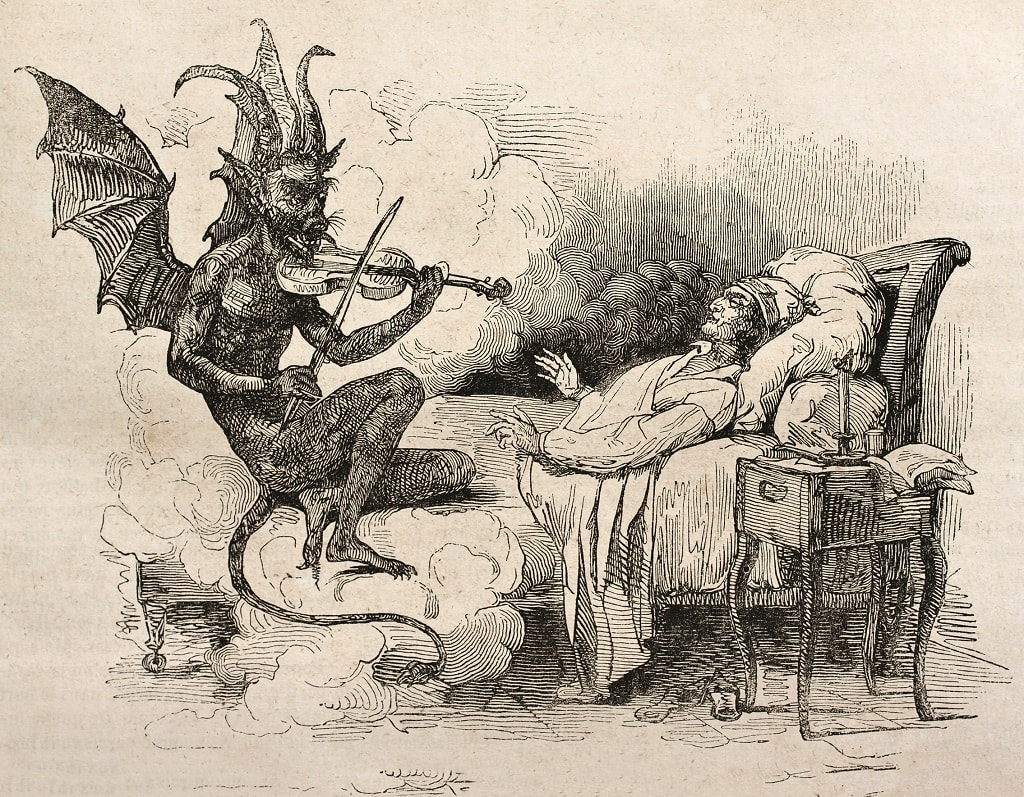 Существует несколько легенд, связанных с любовью черта к скрипке. Одна из главных – история, произошедшая в 1713 году. Главный скрипач-виртуоз того времени, итальянец Джузеппе Тартини, рассказывал, будто бы во сне к нему явился дьявол. Музыкант дал ему скрипку, чтобы послушать, как тот играет, – и нечистый исполнил такую потрясающую мелодию, что Тартини почувствовал себя заколдованным. Проснувшись, скрипач помчался записать услышанную музыку, но – по его собственному признанию, она оказалась в сотню раз хуже исполненной дьяволом вариации. Сонату соль минор, сочиненную (или записанную) Тартини, так и называют – «Дьявольская соната» или «Дьявольская трель», и она довольно популярна у скрипачей, желающих продемонстрировать виртуозную игру.