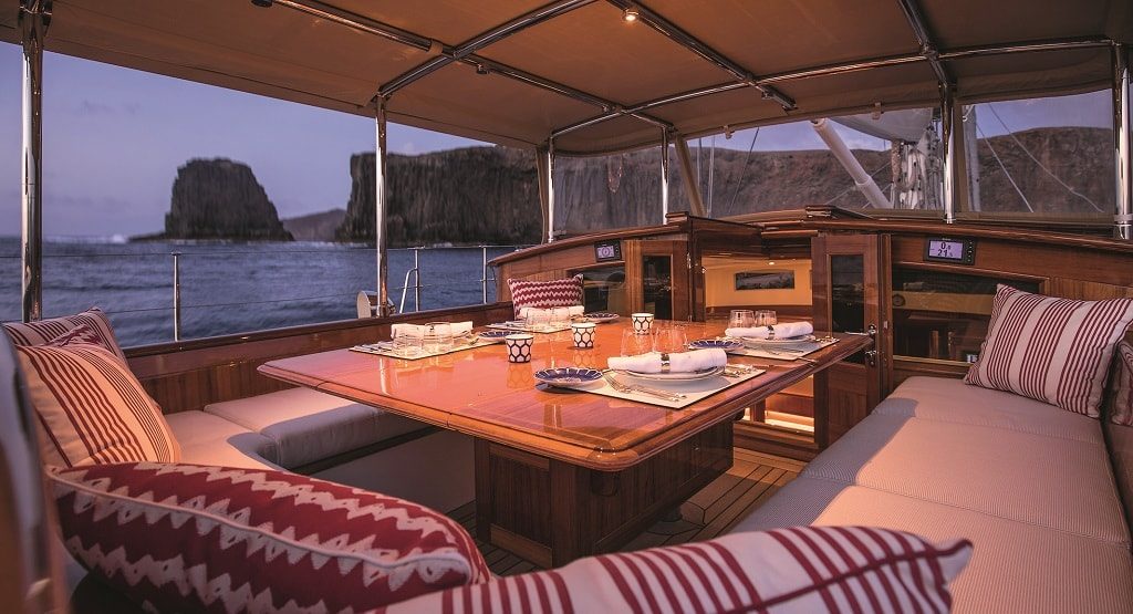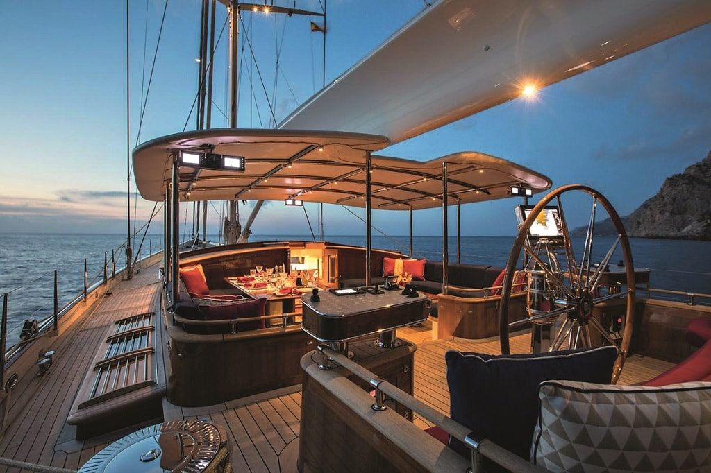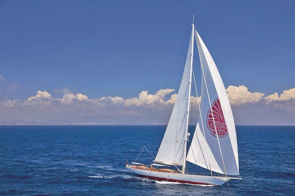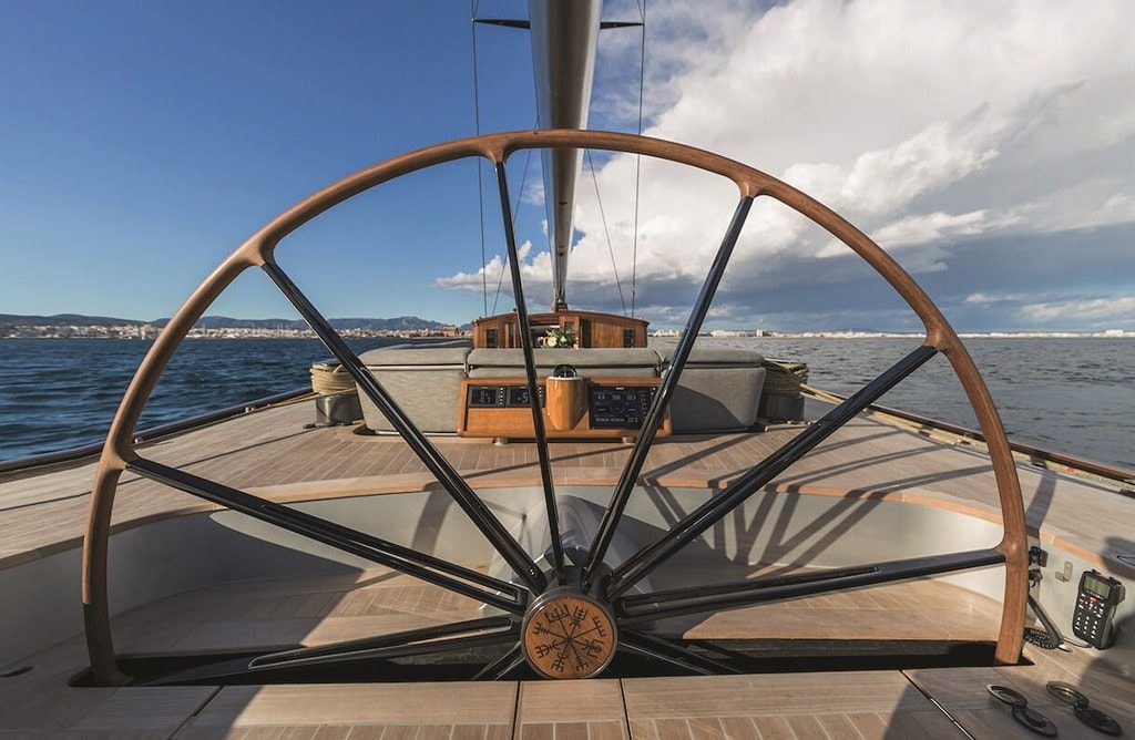 Глядя на эти обводы, изящный свес кормы и надстройки в виде старомодных павильончиков, трудно предположить, что перед нами не аутентичный деревянный парусник, а вполне современная яхта, построенная из алюминия и несущая карбоновую мачту. Спроектирована она в полном соответствии с классическими традициями, и это касается не только экстерьера, но и внутреннего обустройства (Holden & Dupuy Interiors): ультраконсервативный «джентльменский» дизайн, обилие красного дерева и мрамор сорта Calacatta Michelangelo вполне каноничны.