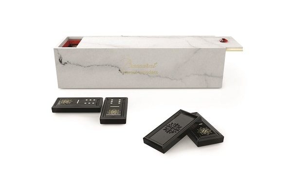 Так, набор игральных костей, состоящий из четырех прозрачных и одного красного кубика, выполнен из хрусталя с гравировкой и точками-отметками с золотой эмалью. Кости домино из черного глянцевого хрусталя с нанесенными вручную золотыми отметками упакованы в мраморный бокс, обитый изнутри красным фетром. А доска для нард сделана из белого и черного мрамора, тогда как сами нарды сияют прозрачным хрусталем и хрусталем черного цвета.