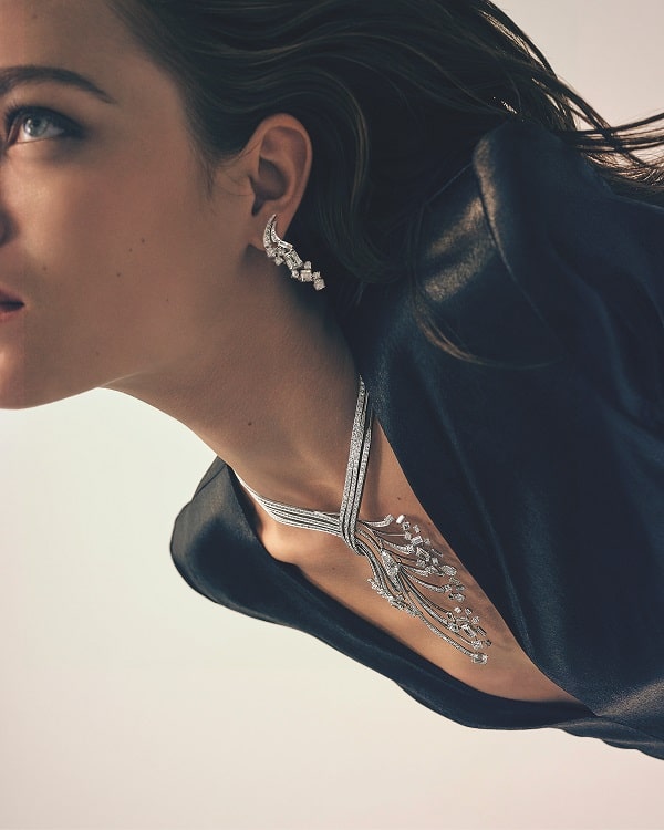 Парюра из восьми новых изделий – продолжение коллекции Torsade de Chaumet – «разливается волнами» и вызывает ощущение стремительного движения воды. Создавая великолепную диадему Deferlante, мастера вдохновлялись старинным рисунком фонтана. Украшающие ее 1600 бриллиантов – словно капельки разбивающихся волн. В трехрядном колье бриллианты, увлекаемые «течением», будто скатываются к декольте. Среди них – превосходный грушевидный камень в 3,57 карата особой прозрачной чистоты. Не менее прекрасен бриллиант весом 6,05 карата в асимметричном кольце. Роскошные камни в серьгах, броши и секретных часах идеально гармонируют с виртуозно исполненной оправой.