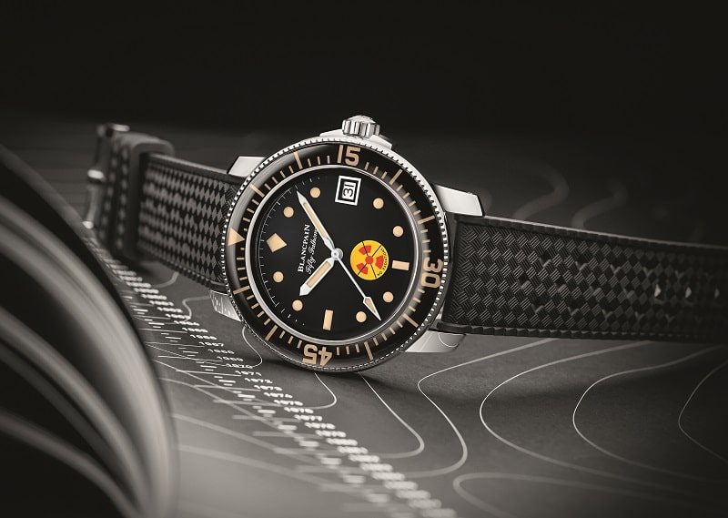 Созданную в 1960-х и служившую частью экипировки военных водолазов, эту модель отличает значок, указывающий на то, что Blancpain не использует люминесцентные материалы, в составе которых присутствует радий. Именно благодаря желто-красной отметке No Rad в свое время часы завоевали большую популярность. На матовом черном циферблате новинки, украшенном геометрическими часовыми индексами, этот значок также остается доминирующим элементом. Стальной корпус обновленной модели, обладающий водонепроницаемостью до 300 м, имеет диаметр 40,3 мм – эксклюзивный для Fifty Fathoms. Еще одна характерная черта современной коллекции – сапфировая вставка, которой дополнен однонаправленно вращающийся безель с градуированной шкалой, типичной для первых моделей Fifty Fathoms. Ободок циферблата, стрелки и шкала безеля покрыты Super-LumiNova® цвета «старого радия». Часы представлены на каучуковом ремешке типа «Тропик», популярном во времена выпуска первой модели No Radiation. Тираж часов всего 500 экземпляров.