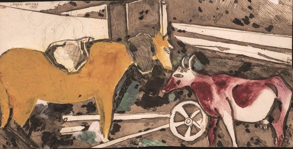 Шагал М. «Лошадь и корова». 1914 г. Бумага, наклеенная на бумагу; акварель, масло, тушь. Вятский художественный музей им. В.М. и А.М. Васнецовых
