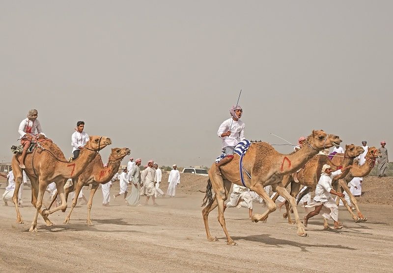 С октября по март в Омане – сезон верблюжьих скачек. Соревнования, пользующиеся у местных жителей большой популярностью, проводятся по всей стране, а завершаются в городе Барке в провинции Аль-Батина – в его окрестностях есть множество хозяйств по разведению верблюдов. Раньше жокеями на скачках были дети, а теперь их заменили роботы.