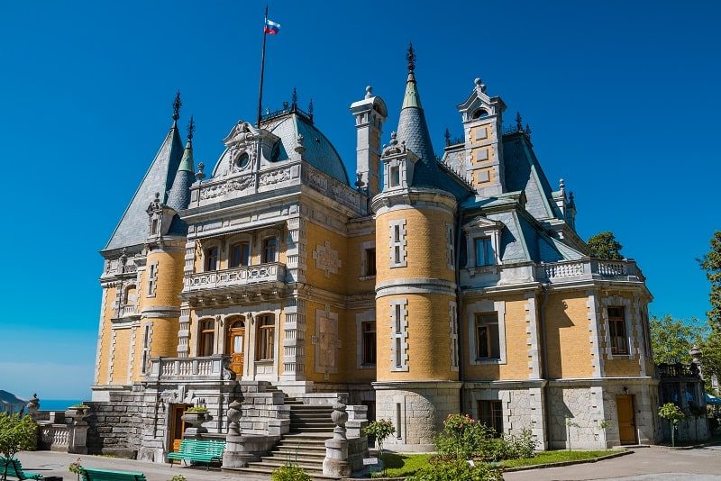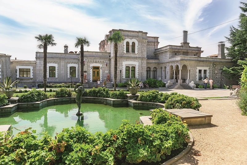 «Вам деньги, мне титул», – отчеканила Анна Голицына, вверяя своему супругу князю Ивану Голицыну сундук с деньгами. Супруги заключили сделку и больше не виделись. В 1824 году Голицына перебралась из Петербурга в Кореиз, где и возвела на скалах дачу под названием «Розовый дом». При каждом новом владельце она перестраивалась и в итоге оказалась во владении князя Феликса Юсупова, бывшего московского генерал-губернатора. При нем особняк обрел современный вид стараниями известного крымского архитектора Николая Краснова (он же проектировал и Ливадийский дворец).Здесь состоялась помолвка Феликса Юсупова-младшего с племянницей императора Николая II, княжной Ириной Александровной. Особняк на Южном берегу Крыма, включая парк с гранитными львами и видами на Ай-Петри, он не любил, считал уродливым. Но несмотря на это, его семья жила здесь каждое лето и устраивала шумные банкеты и приемы.После революции дворец был национализирован, и в нем два лета кряду прожил уже третий Феликс – Дзержинский. К этому времени была сделана перепланировка, оригинальные интерьеры были утрачены, утварь уничтожена. Самым известным постояльцем Юсуповского был Иосиф Сталин – ему довелось ночевать в бывших винных погребах, превращенных в бункер. Для посещения дворец открыли совсем недавно. Можно прогуляться и по залам, и по парку, в котором высажено почти 7,5 тыс. растений. Каменные львы все так ж же охраняют розы.