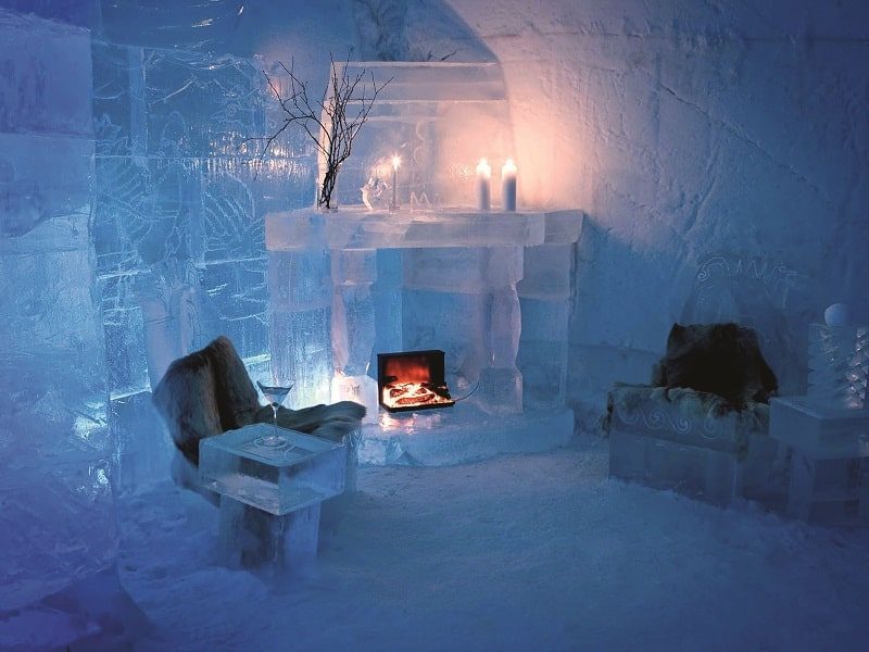 Arctic Snow Hotel в 25 км от Рованиеми, прямо на Полярном круге, похож на сказочный замок Снежной королевы – с длинными снежными коридорами, парадными залами из прозрачных блоков льда с таинственной подсветкой, барами, ресторанами и красивыми номерами. Интерьеры, кстати, каждую зиму разные.