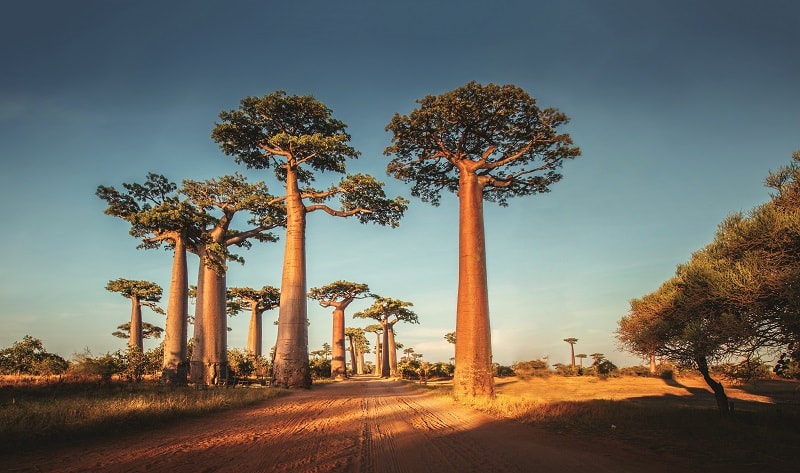 Легенда гласит, что когда-то это дерево задумало дорасти до неба и поплатилось за это. Бог наказал его – вырвал из земли, перевернул и воткнул обратно. С тех пор оно и растет «корнями вверх». Баобабы, тем не менее, всегда приносили пользу мальгашам. Из их древесины они делали волокна для рыболовных сетей, циновок и даже тканей. Молодые листья шли в салаты и супы, из семян готовили напитки. Отвары из коры помогали лечить множество болезней – от простуды до дизентерии. Сегодня, по большому счету, все это уже никому не нужно, и баобабов с каждым годом становится все меньше. Эти деревья растут несколько сотен лет, а современная цивилизация вольно или невольно уничтожает молодые побеги. Но пока лучший район для любования баобабами – область Морондова, где можно найти шесть видов этих деревьев. При том, что на континенте сохранился только один! Диаметр стволов самых старых достигает 8 м.