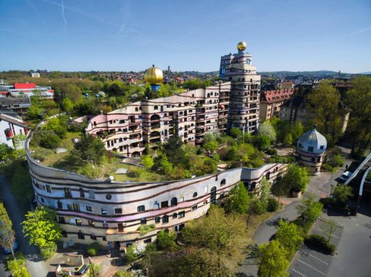 Австрийский архитектор Фриденсрайх Хундертвассер (1928-2000) не причислял себя к какому-то конкретному стилистическому направлению, но его искусство очевидно имеет много общего с авангардом и сюрреализмом. Он не принадлежал к первому, «настоящему» поколению сюрреалистов, в отличие от Дали и де Кирико, и поэтому его творчество вместило многие более поздние идеи. В частности, для него очень важной концепцией была экологичность, единство с природой. Построенные им здания оказываются наполнены этой живой природой: в них часто нет ни единого прямого угла, а краски – нетипичные для скучных строек, зато радующие глаз, как цветок. Все его дома поражают своим «органическим сюрреализмом», они будто выросли сами, а не были построены. «Лесная спираль» – многоквартирный дом в Дармштадте, на фасаде которого тысяча окон, причем ни одного одинакового нет. Он был построен в 1990-е годы, но кажется, что мог выйти из любой сказки, любого фантастического фильма.