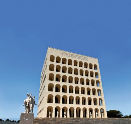 Это здание, построенное в 1939 году архитекторами Джованни Гверрини, Эрнесто Бруно Ла Падулой и Марио Романо для Всемирной выставки 1942 года, получило прозвище Квадратный Колизей и стало одним из символов воскрешения античных вкусов при тоталитарном режиме Муссолини. Однако искусствоведы видят в нем и другие подтексты. Историк архитектуры Генри-Рассел Хичкок утверждал, что в этом здании очевидна «навязчивая сила де Кирико, подобная чему-то из сна». Действительно, сходство Квадратного Колизея с пейзажами Джорджо де Кирико, особенно 1911-1914 годов, несомненно: это не привычная нам «реалистичная» античность, а метафизическое сноведение, ирреальный мир. При взгляде на это римское здание возникает странное чувство дезориентации: это достигается его гигантскими объемами, пропорциями, отсутствием детализации, наличием фальш-деталей, которые кажутся настоящими, но наше подсознание отмечает их ненормальность, а также эффектами резкого контрастного освещения.