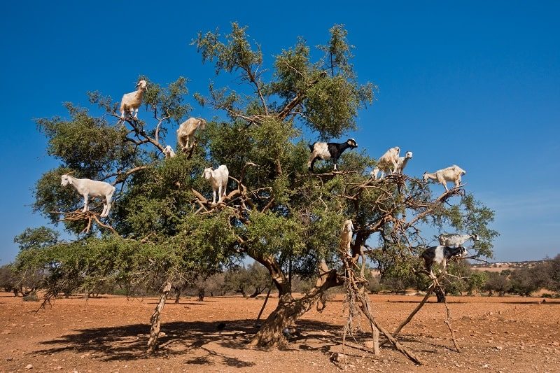 Самое яркое из дорожных впечатлений – это, конечно же, козы, которые словно обезьяны забираются на ветки деревьев пощипать свежую листву. Пастухи-мальчишки ревниво следят за туристами, чтобы те, не дай бог, не сфотографировали это чудо бесплатно: чуть что не так – бьют палкой по стволу, и козы послушно прыгают на землю. Кстати, по одной из научных гипотез, именно благодаря неуемному козьему аппетиту на месте некогда цветущих африканских равнин и образовалась гигантская Сахара.